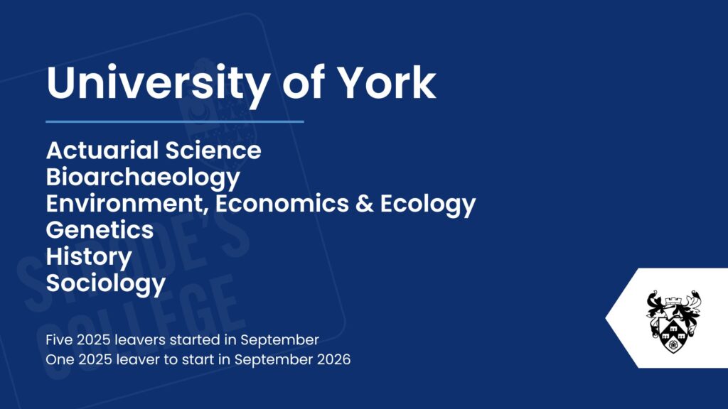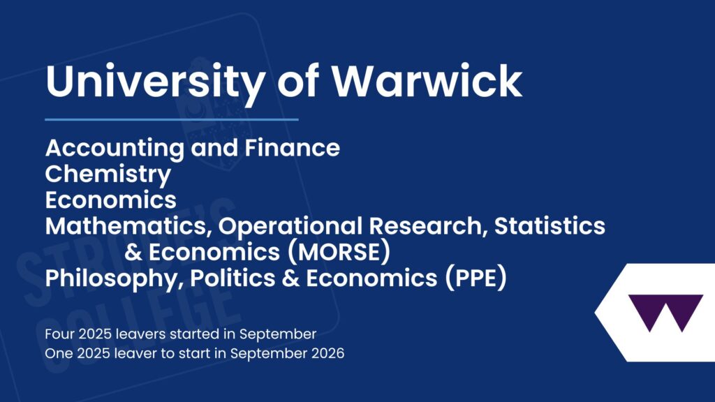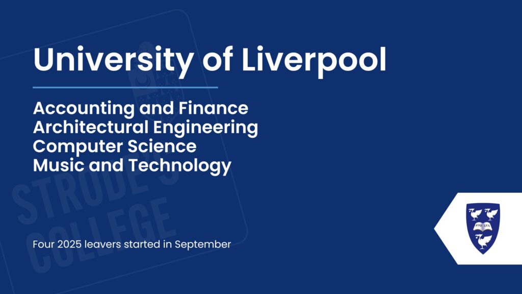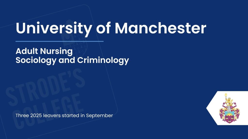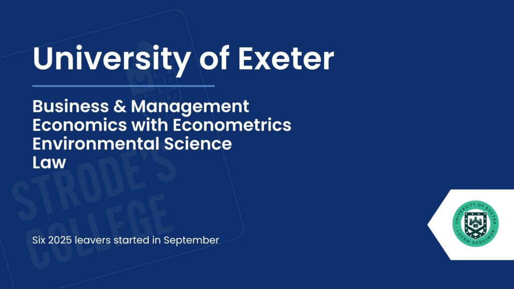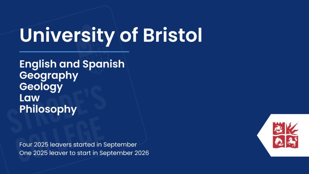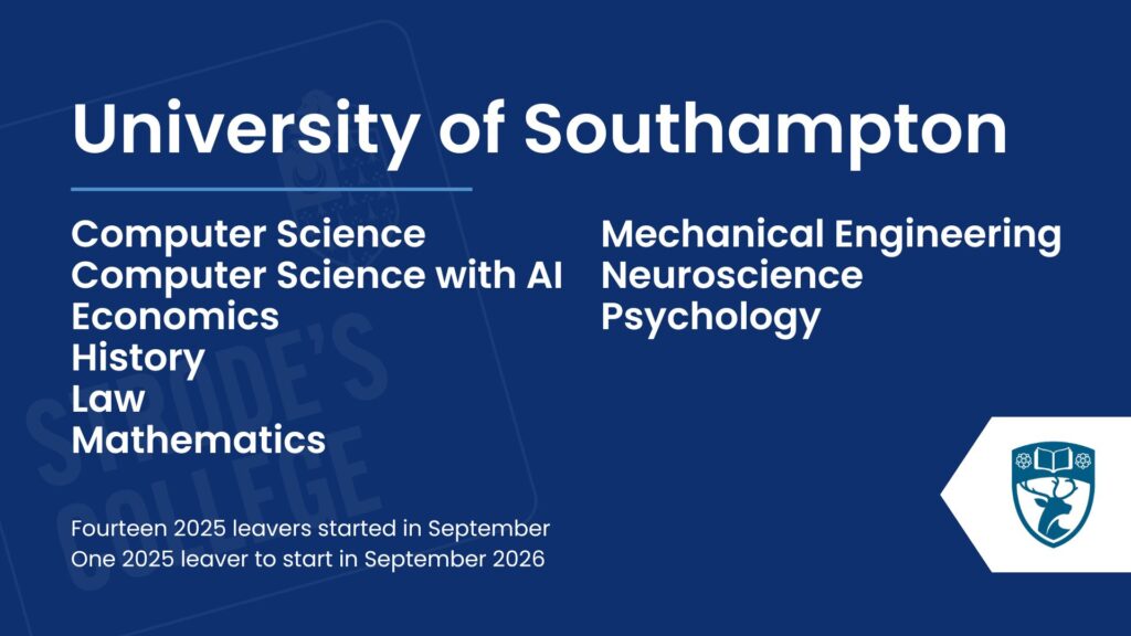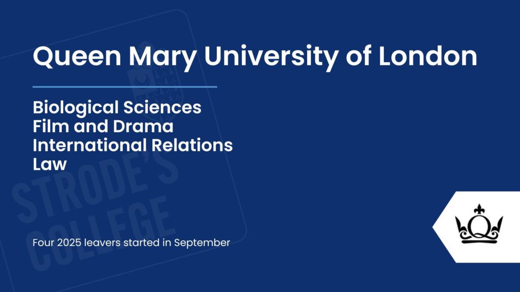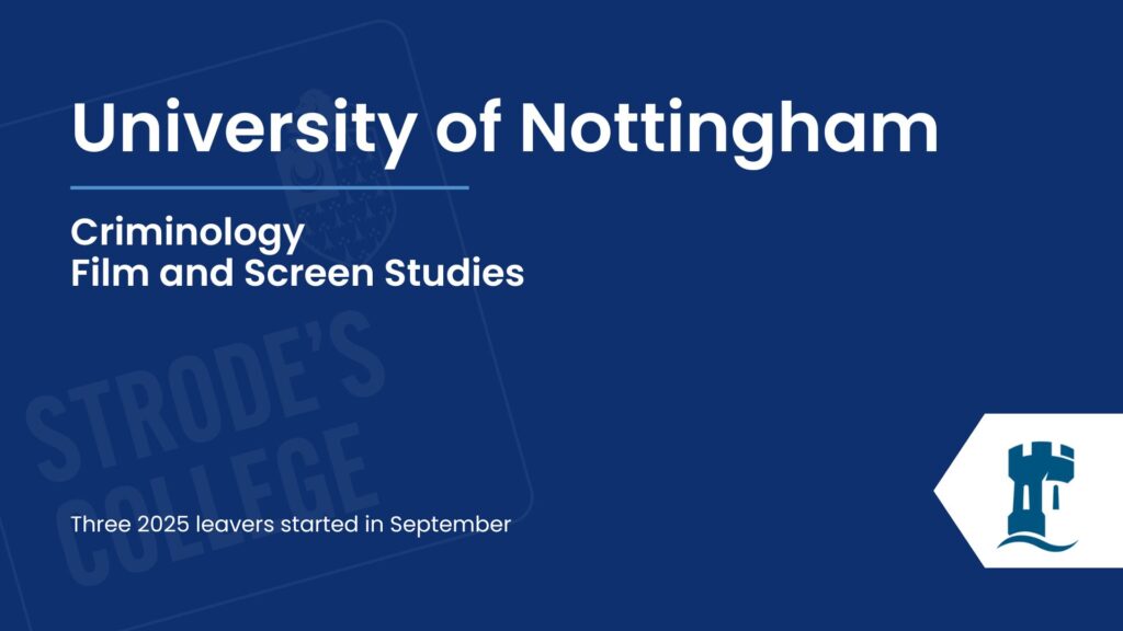 Our students progress to a wide range of exciting destinations after Strode’s College, with many choosing well-regarded universities across the UK. Royal Holloway stood out as the most popular choice for our 2025 leavers, followed by St Mary’s University, Twickenham, and Kingston University. Other popular destinations included Nottingham Trent, the University of Southampton, and the University of Surrey. This diverse spread highlights the ambition of our students and the variety of pathways available, reflecting both academic success and the confidence to pursue opportunities at universities that best suit their goals and aspirations.